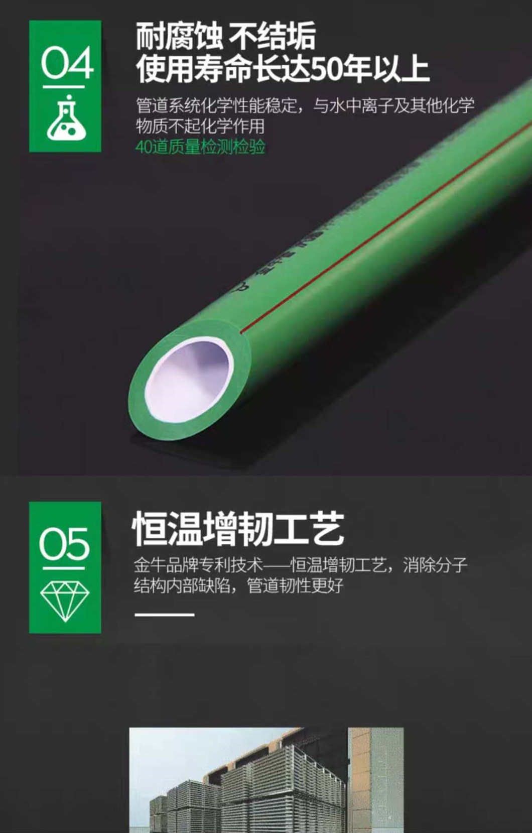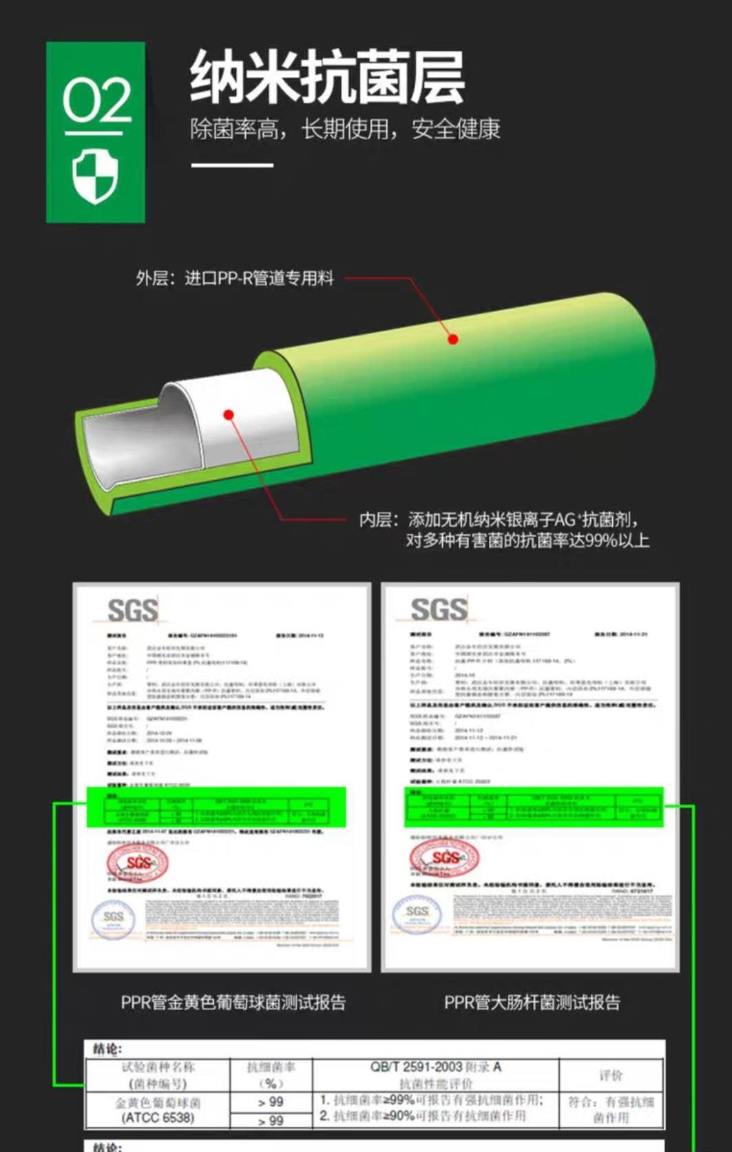 沃盾PP-R抗菌精裝管,采用進口PP-R 管道專用料,保障管道優(yōu)異性能,管材通過恒溫韌工藝處理,極大的增強了管材的韌性 強度,造就了優(yōu)異的抗沖擊性。